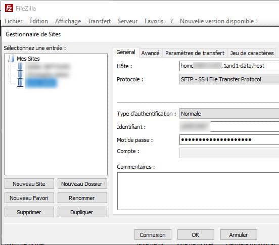 Commencer par télécharger le logiciel. Ensuite, sur ionos, Hébergement SFTP & SSH, cliquer sur l’engrenage de droite de la ligne du compte et sur Afficher les données de connexion. Avec un peu de concentration, vous pouvez directement entrer les 6 paramètres dans FileZilla – Fichier – Gestionnaire de sites. Vous pouvez sauvegarder et vous connecter. Dans la partie haute, vous visualisez les échanges avec le serveur jusqu’à l’affichage sur la droite des fichiers du serveur, sur la gauche vous soyez les fichiers du répertoire local de votre disque (Vous pouvez en préciser un particulier dans l’onglet avancé de la page de paramétrage du gestionnaire de sites.